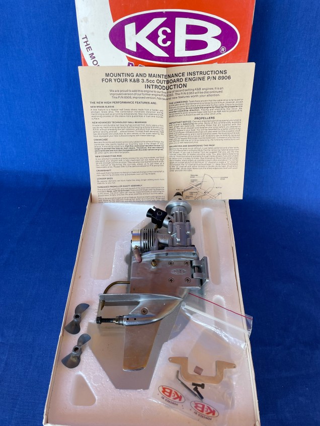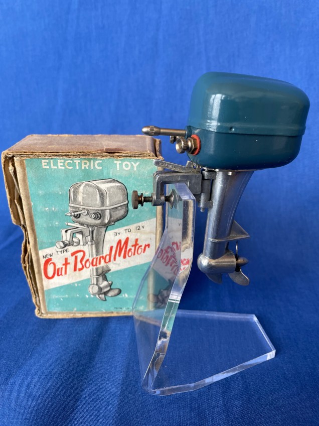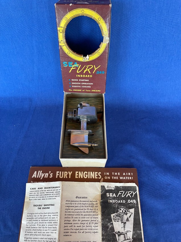 Alterscale (re-sale) 1997 Mariner 225 Super Magnum w/box and instructions. AS NEW. $400 SOLDCameron .19 special heavy duty water-cooled marine engine w/box. Good compression, excellent condition. $50Allyn Sea Fury Twin Cylinder gas powered outboard, good compression, excellent condition $495Allyn Sea Fury 049 gas powered outboard with box, instructions, parts list, good compression, complete. Excellent condition $235Japan 3 3/4″ New Type outboard, includes original box. Tries to run but binds, otherwise Excellent + condition. $85K&B 3.5cc 8 1/2″ gas powered outboard with box, instructions, good compression. $160Sakai red top DC motor, couple of paint chips, complete, runs $135Allyn Sea Fury .049 single gas inboard/outboard w/box, instructions & parts list. very good condition, complete $195Atwood .051 water-cooled gas powered outboard, good compression $225Early plastic Lindberg 4 1/2″ “Neptun” outboard, runs $75