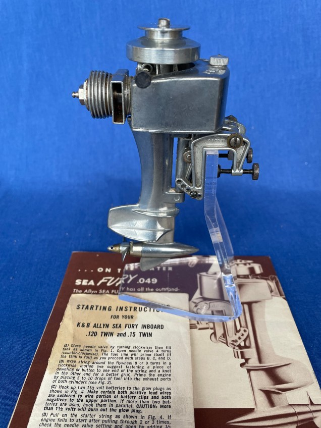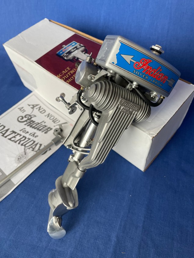 Ted Maciag Indian Silver Arrow gas outboard motor w/box & instructions & stand upright. Missing stand base, decal damage as pictured, flywheel loose, motor stuck. $1500Allyn Sea Fury .049 Gas outboard motor with original instructions and parts list. Excellent condition, good compression $195Sakai red top DC motor, couple of paint chips, complete, runs $135Cameron .19 special heavy duty water-cooled marine engine w/box. Good compression, excellent condition. $50Japan 3 3/4″ New Type outboard, includes original box. Tries to run but binds, otherwise Excellent + condition. $85K&B 3.5cc 8 1/2″ gas powered outboard with box, instructions, good compression. $160Allyn Sea Fury .049 single gas inboard/outboard w/box, instructions & parts list. very good condition, complete $195Early plastic Lindberg 4 1/2″ “Neptun” outboard, runs $75