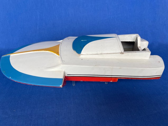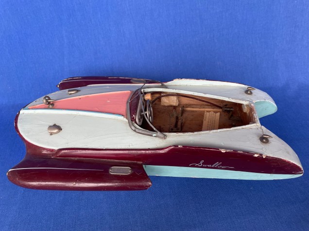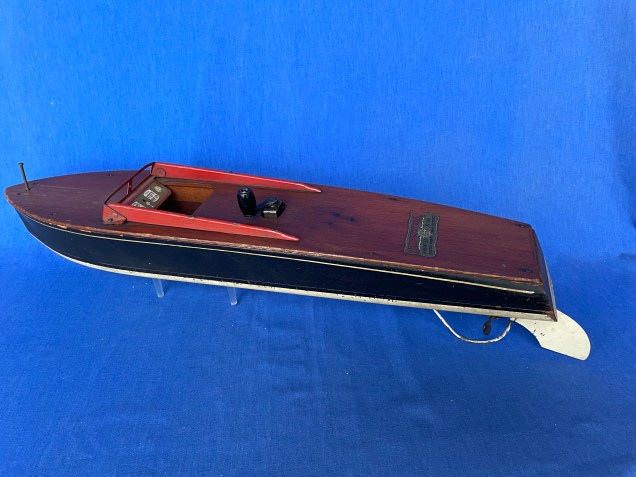 ITO 16″ wood Japanese hydroplane outboard boat, good condition. $250ITO 16″ Swallow Japanese wood outboard boat, good condition. $325Kellner 25″ German wood boat with working clockwork motor, good condition. $225Seaworthy 23″ wood boat with working clockwork motor. Very good condition $275ITO G-3 wood 13″ double cockpit runabout, motor runs. $275Blue Box Toys plastic car, boat and trailer, Vacationer set with box. Excellent condition $65 Vintage 22″ wood steam powered boat, solid wood hull w/ removable deck $65018″ Japan Deluxe Inboard boat, single engine, twin props. $195Belco Meteor plastic battery powered speed boat with outboard. Made in Western Germany, w/box and instructions. Runs $12526″ Seaworthy Boats Runabout Windup $125Phillips 66 Battery operated plastic cabin cruiser w/box. Missing a couple of small cleats. Runs $75Matchbox Lesney Products 1971 Speed Kings K-25 boat, motor & trailer with box, excellent toy. Box a little worn. $4516″ Hornby Speedboat $160Seaworthy Flying Yankee 18″ wood toy boat with (pencil sharpener) clockwork motor, works well, nice decals, very good+ complete condition $3951930s Arnold 8″ pressed steel toy boat w/rower, wind-up that rows, works well after almost 100 years $3751920’s Boucher 24″ wood Poly-Wog boat with 2 cylinder steam outboard engine. Complete, including burner tray. ALL ORIGINAL $95014″ Liberty Playthings Tug Boat $9530″ Made in Japan Destroyer, circa 1950’s, excellent condition $37516″ Hornby Racer III $195